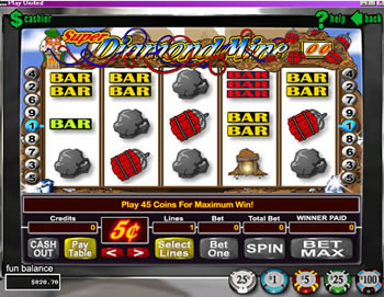 Super Diamond Mine is a 5-reel game, and to view the pay table you must click on the Pay Table button located next to the red Cash Out button on the lower left side of the machine. It may be played in denominations of $.01, $.05, $.25, $.50, $1, and $5.